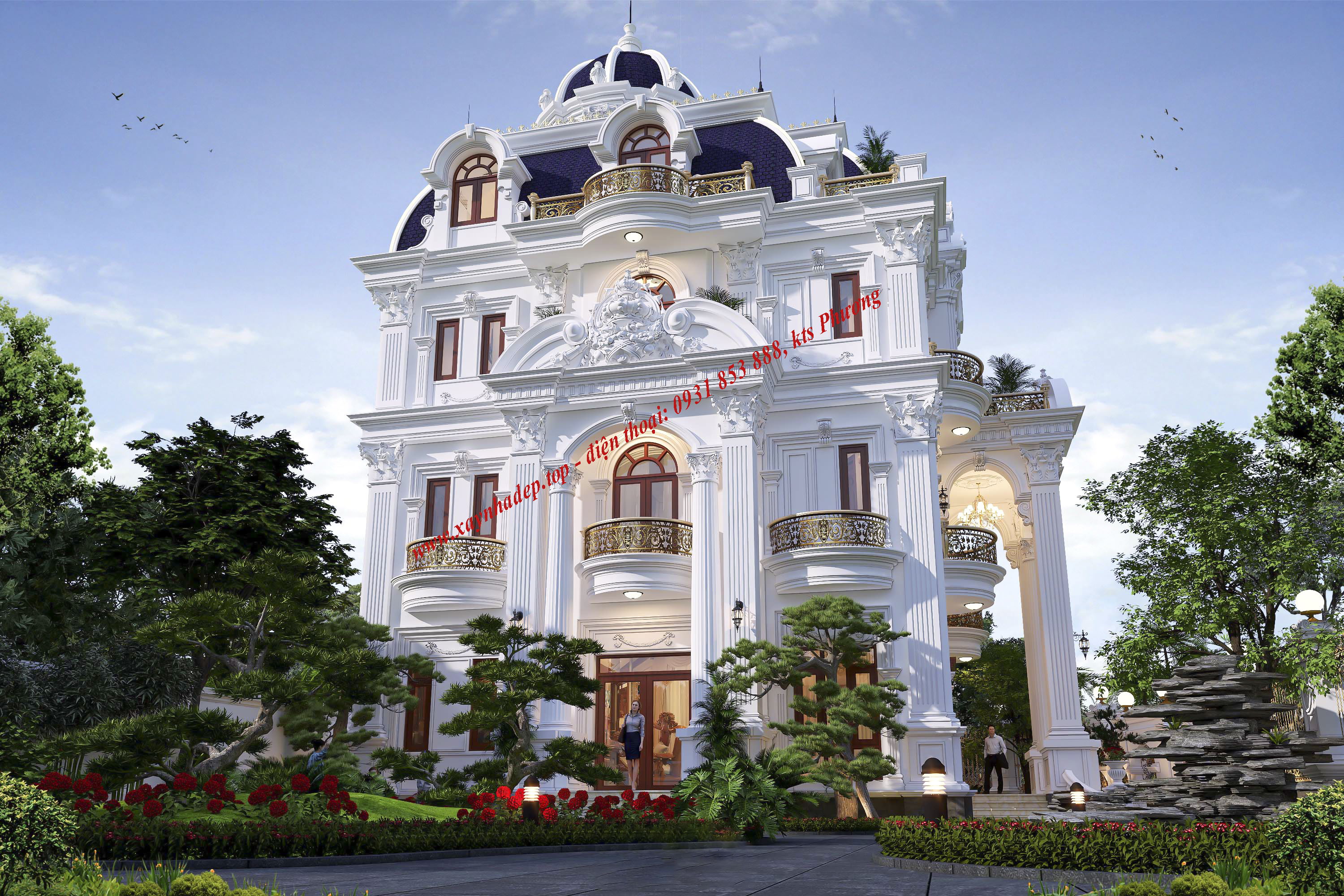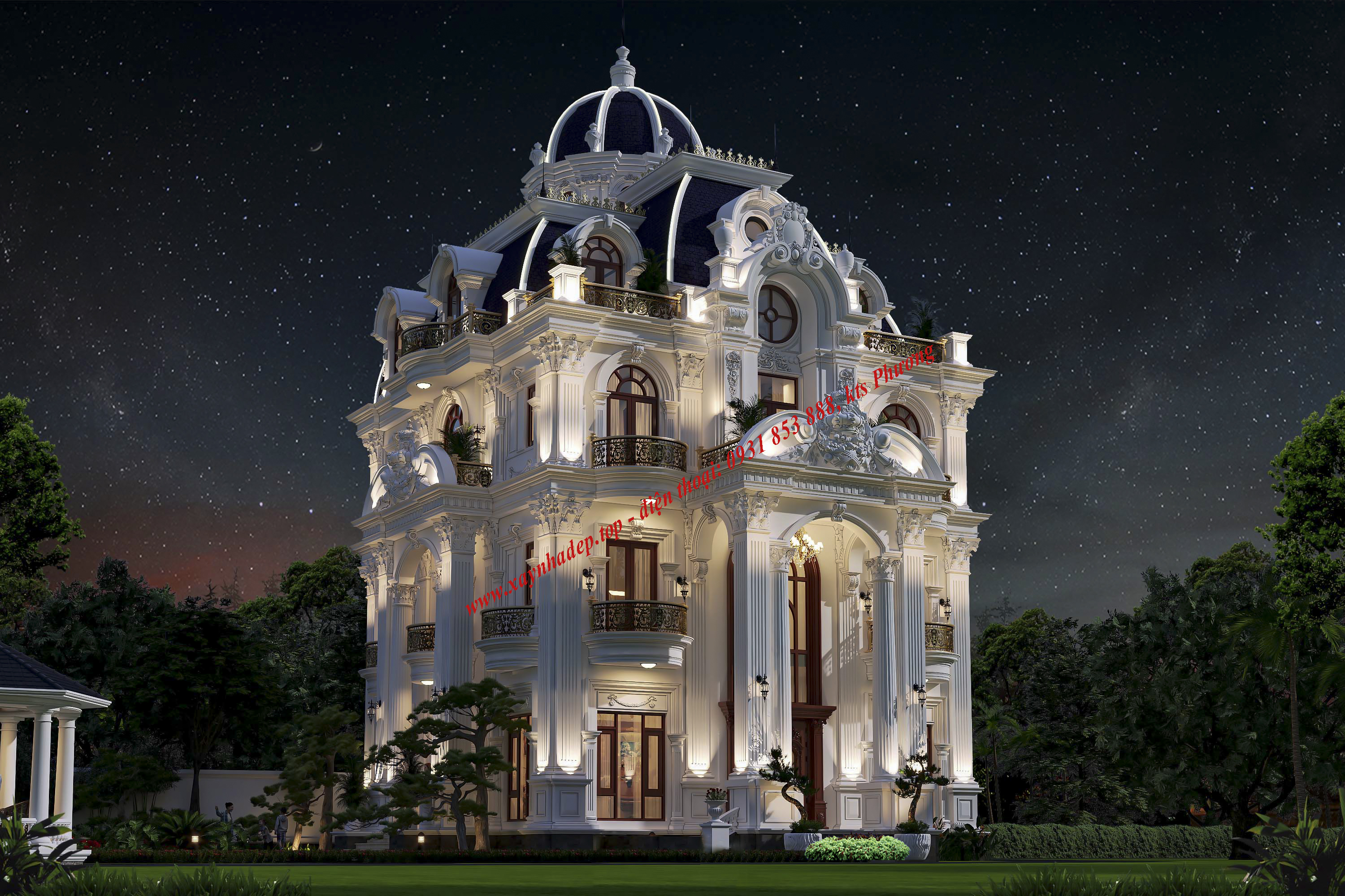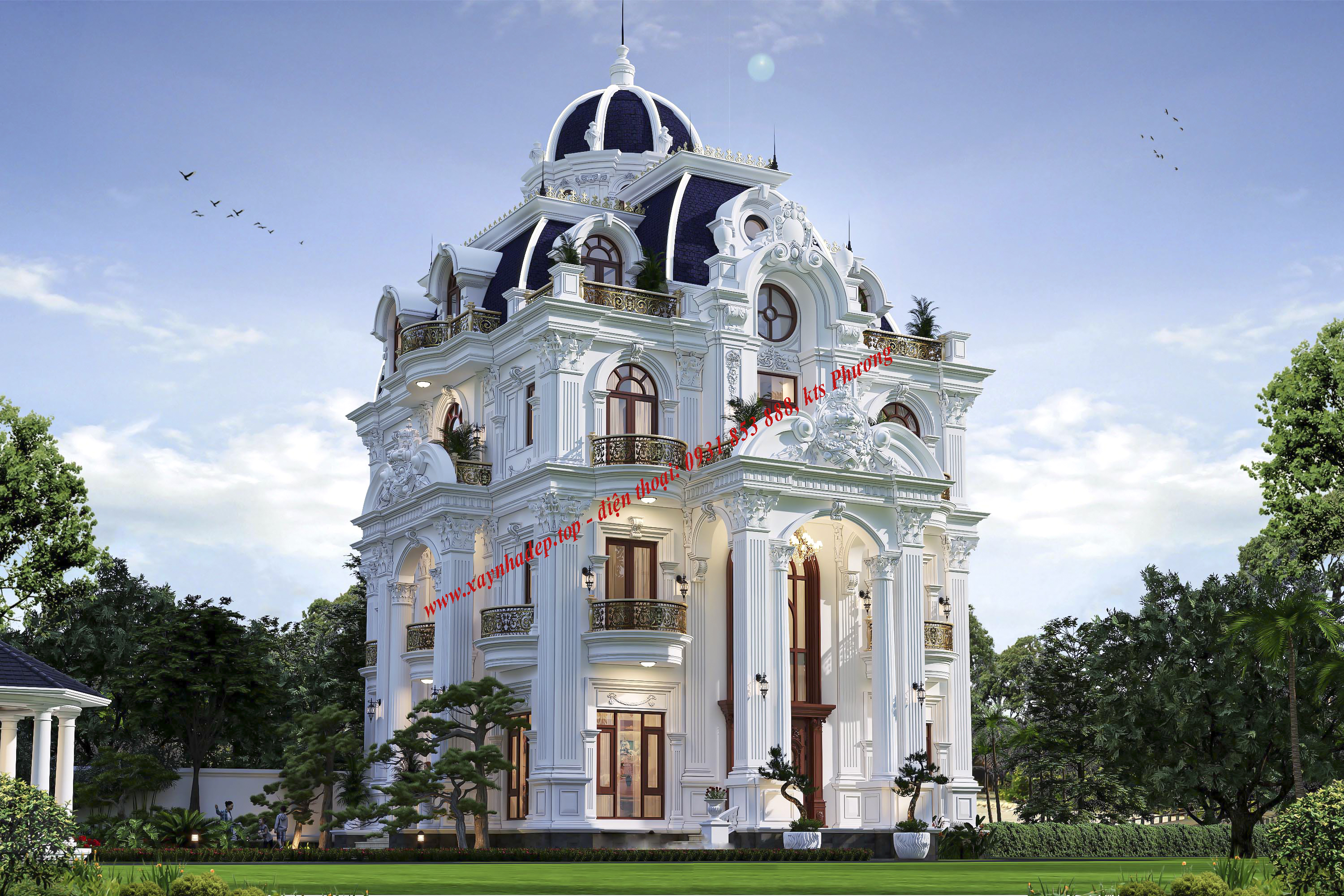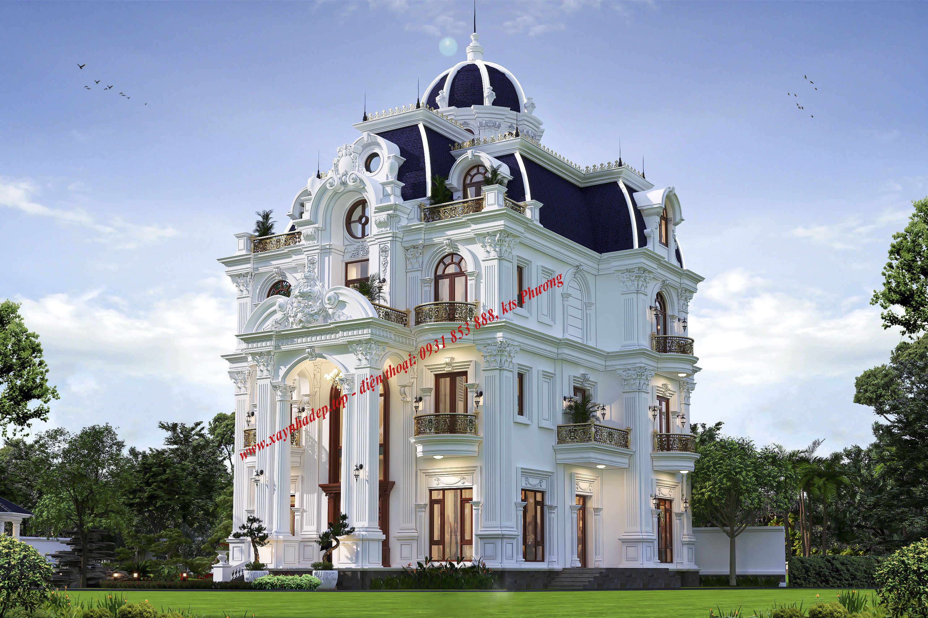 Công trình nổi bật với hệ thống cột trụ lớn, phào chỉ tinh xảo, cùng gam màu trắng sang trọng đặc trưng của phong cách châu Âu hoàng gia. Mái vòm màu xanh than kết hợp ban công uốn cong cùng lan can mạ vàng tạo điểm nhấn tinh tế, thể hiện đẳng cấp và gu thẩm mỹ của gia chủ.