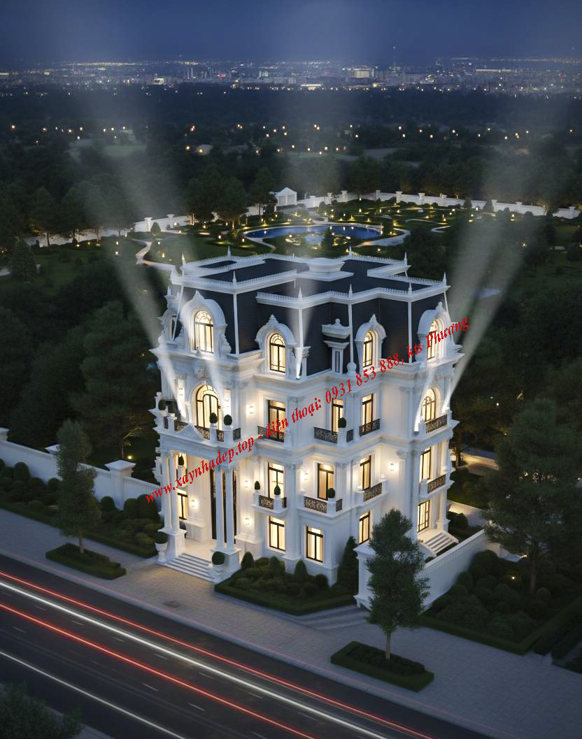 Khi ánh đèn lên, biệt thự trở thành một “tòa lâu đài ánh sáng”: