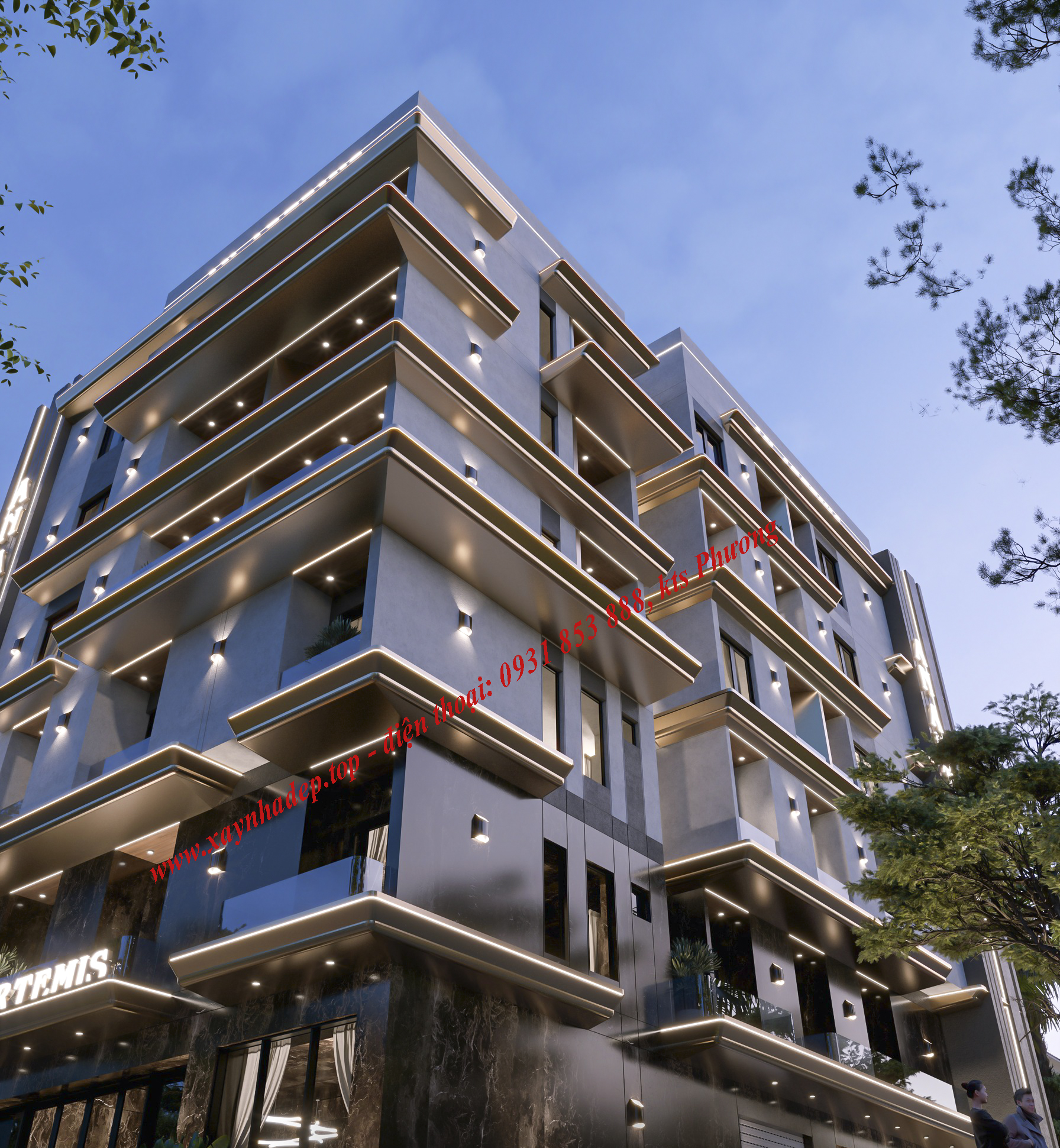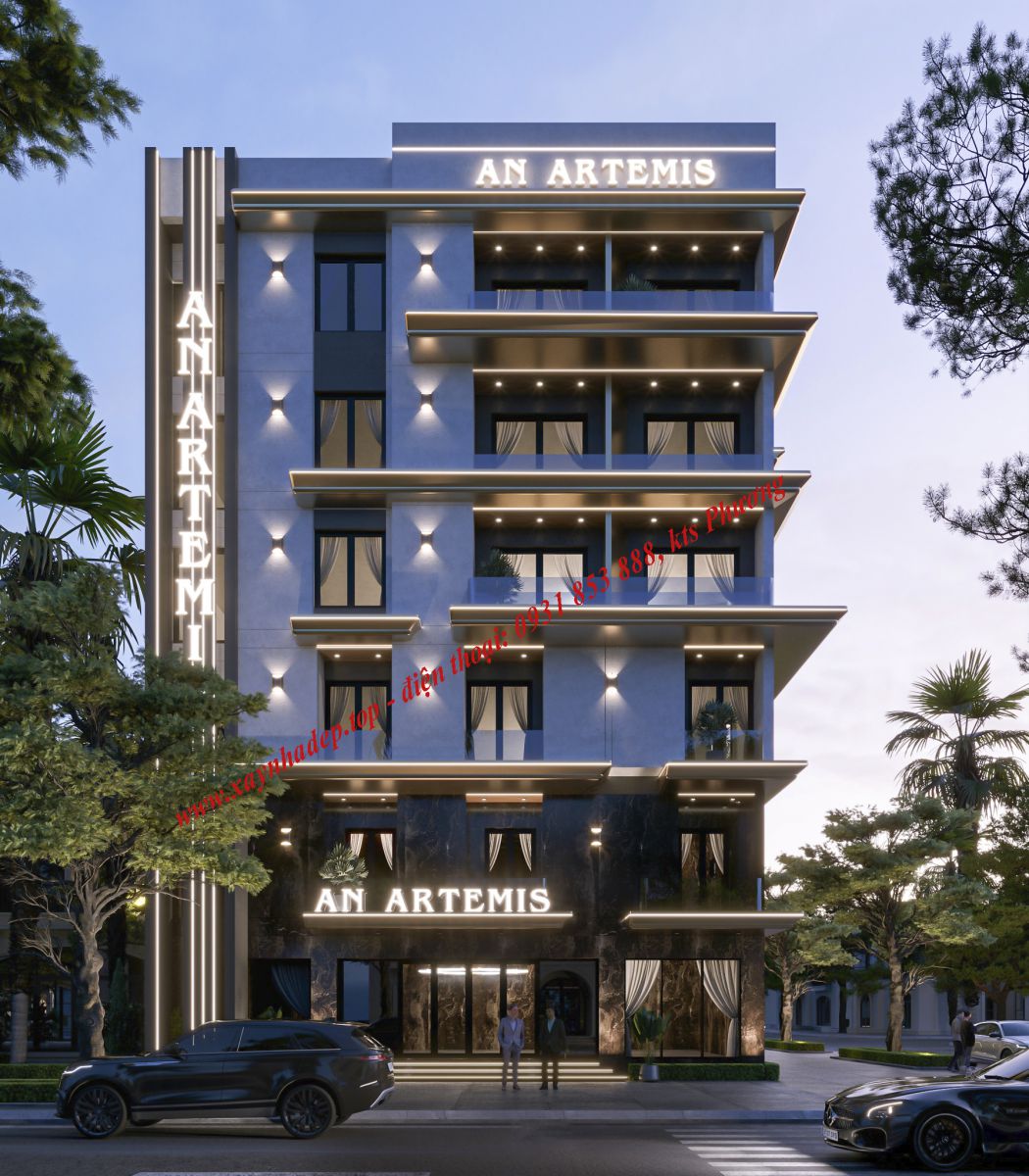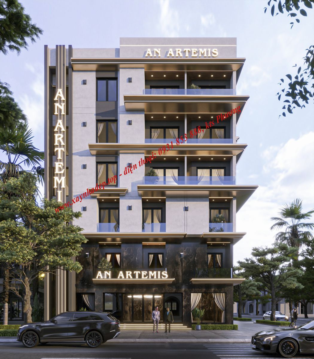 Công trình được thiết kế theo phong cách hiện đại, tập trung vào các đường nét vuông vức, mạnh mẽ và tối giản. Mặt tiền sử dụng vật liệu cao cấp kết hợp hệ thống đèn LED chạy viền tạo điểm nhấn nổi bật vào ban đêm, giúp tăng độ nhận diện thương hiệu và thu hút khách thuê.