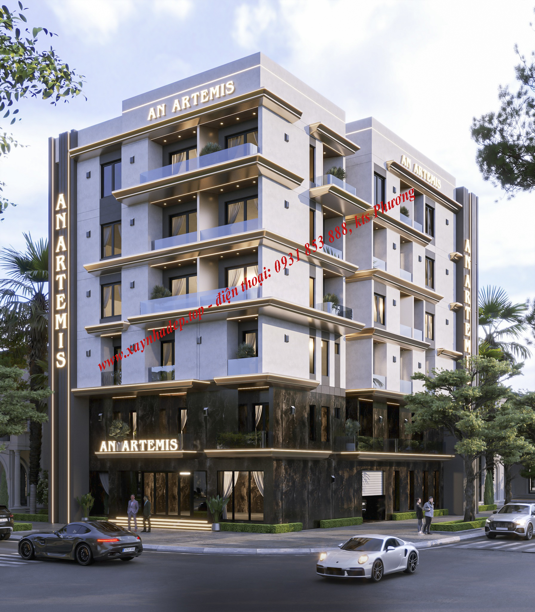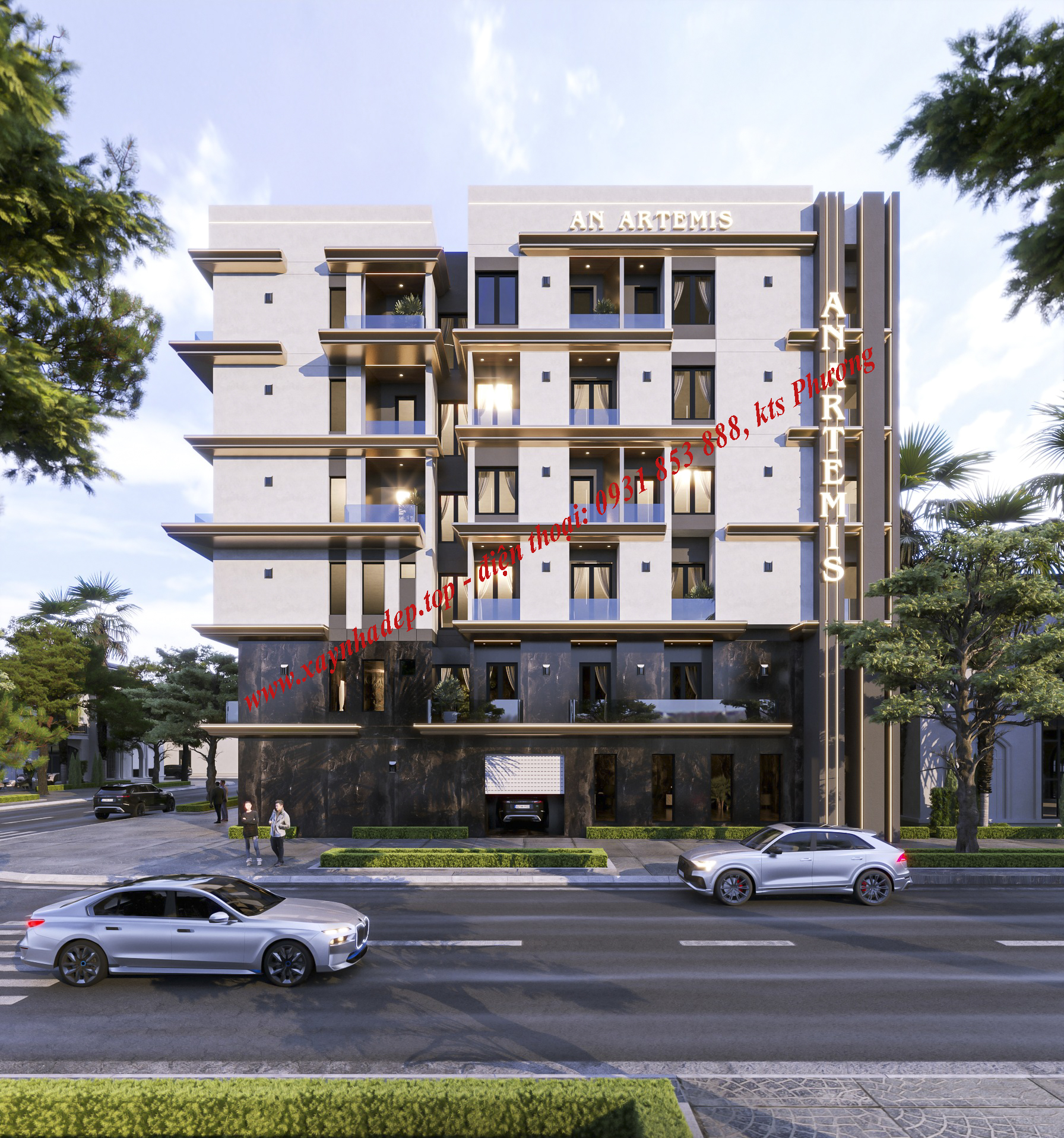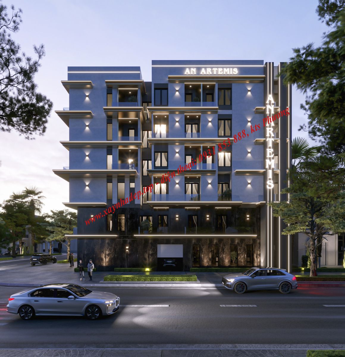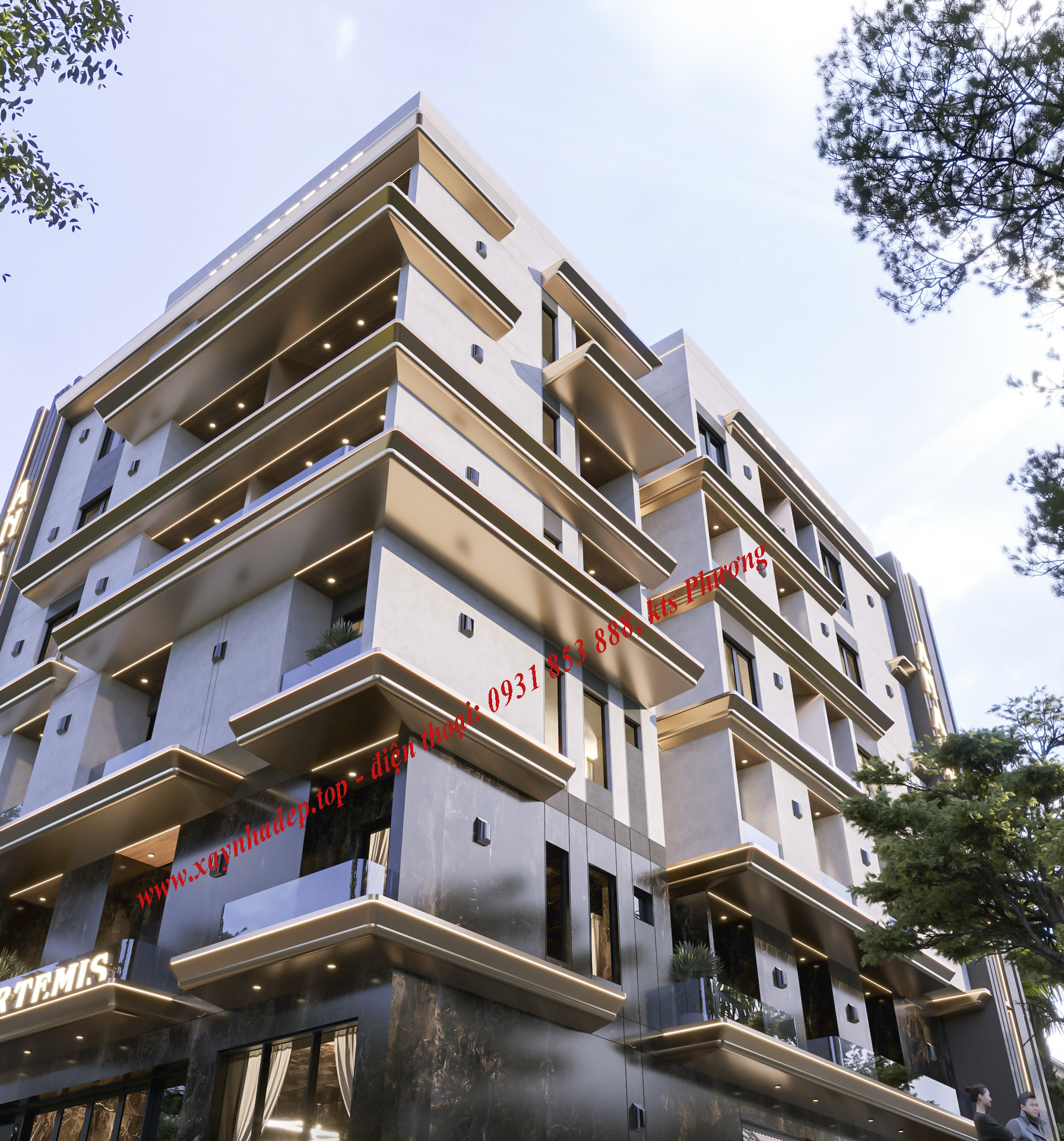 Công trình được thiết kế theo phong cách hiện đại, tập trung vào các đường nét vuông vức, mạnh mẽ và tối giản. Mặt tiền sử dụng vật liệu cao cấp kết hợp hệ thống đèn LED chạy viền tạo điểm nhấn nổi bật vào ban đêm, giúp tăng độ nhận diện thương hiệu và thu hút khách thuê.