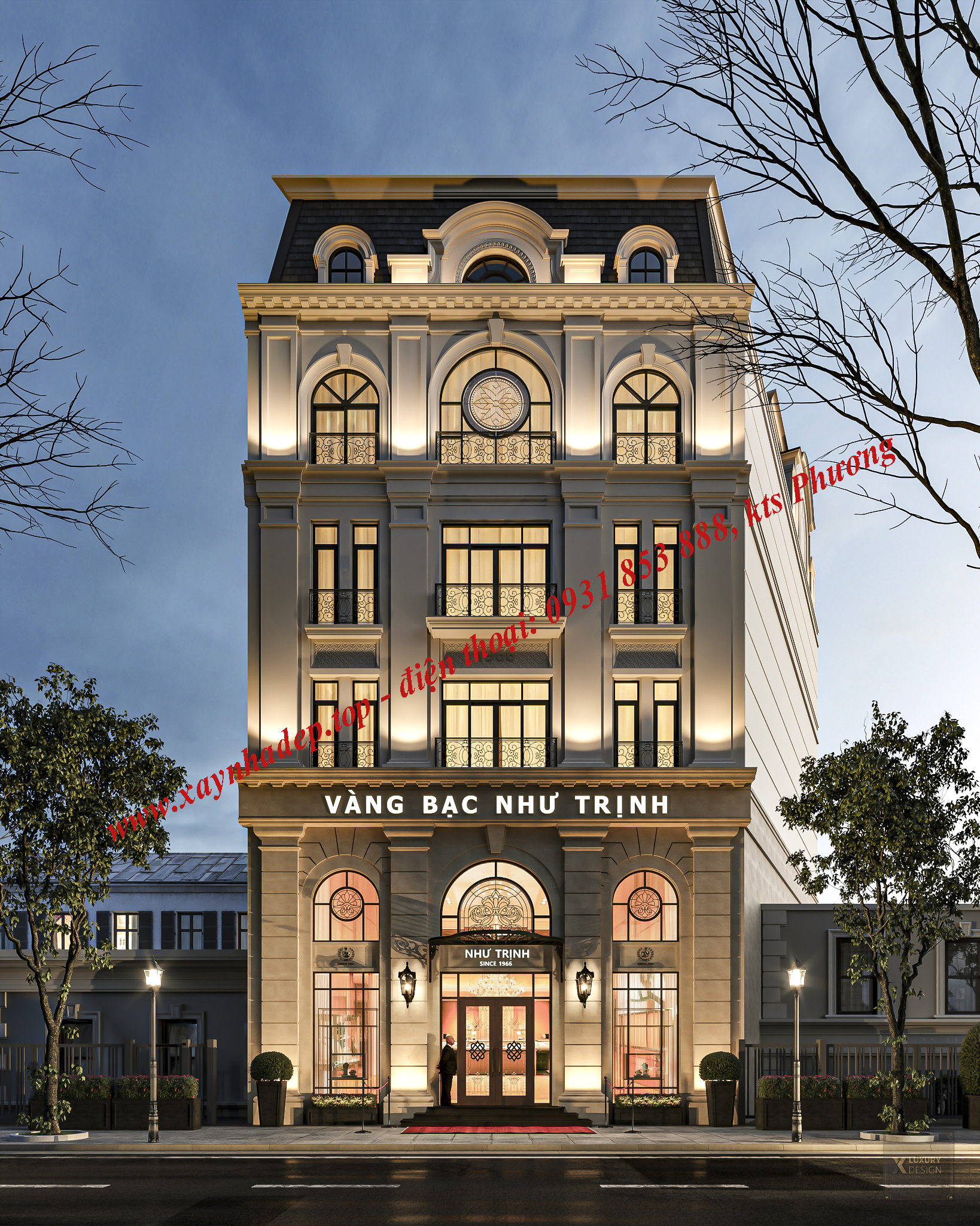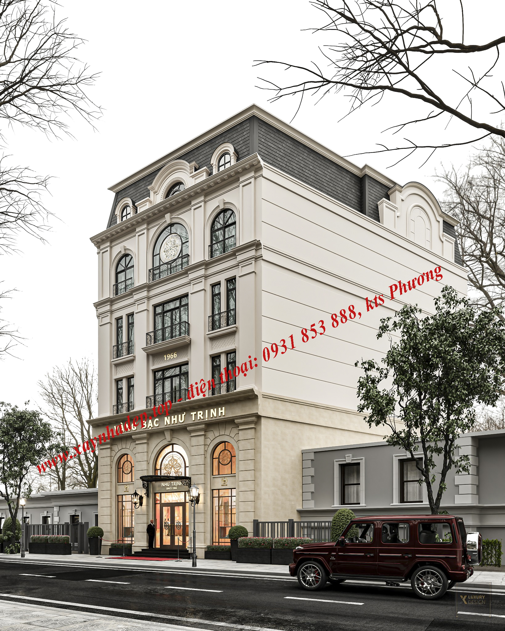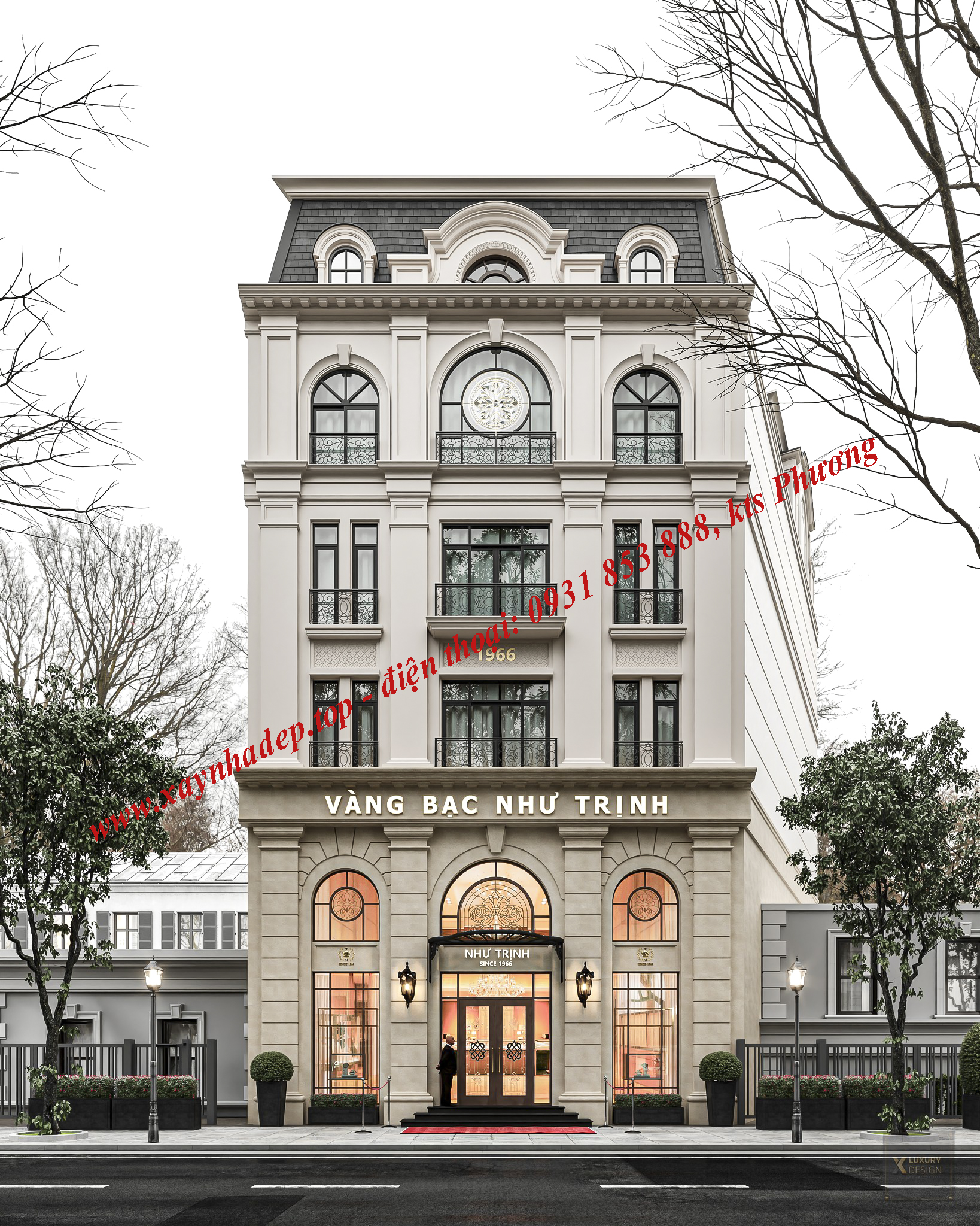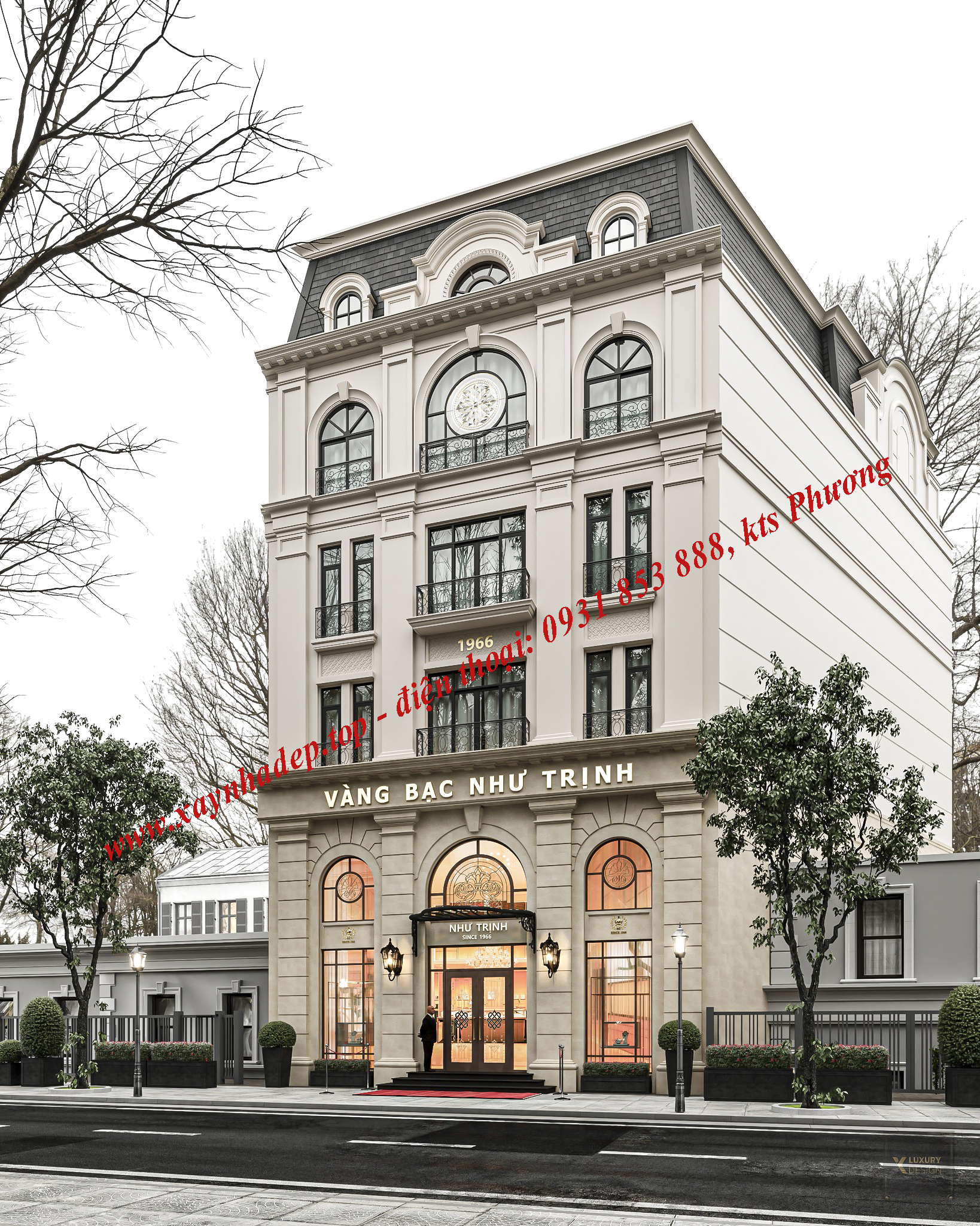 Công trình gây ấn tượng mạnh với mặt tiền tân cổ điển cân đối, sang trọng, lấy cảm hứng từ kiến trúc châu Âu: